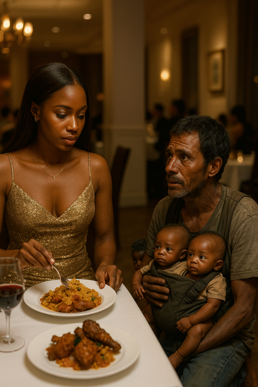Emily froze. Turning, she found a man kneeling beside her table. His jeans were torn, his shirt stained with sweat and dust. Strapped to his chest were two tiny infants—silent, wide-eyed, and visibly malnourished. His voice didn’t beg. His eyes didn’t plead. He wasn’t asking for himself. He was asking for them.