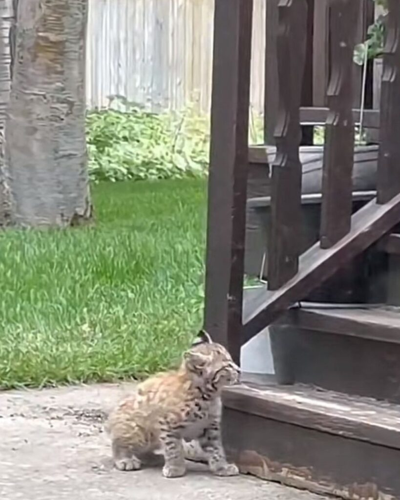 In the video, a cute bobcat cub is seen confidently wandering around the porch, checking out the furniture, and trying to climb the fence.